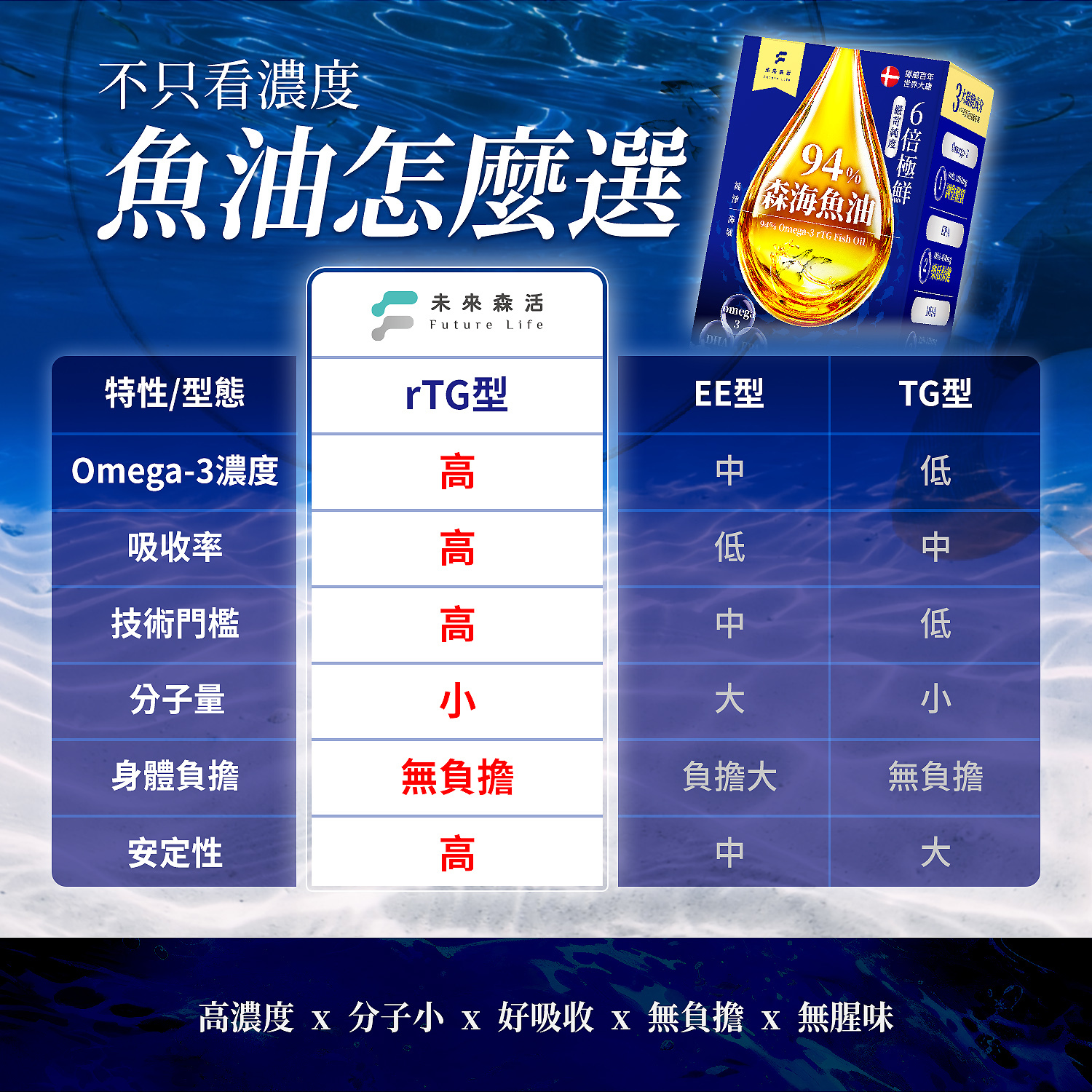 ▸▸ rTG型魚油,Omega-3 濃度達90%