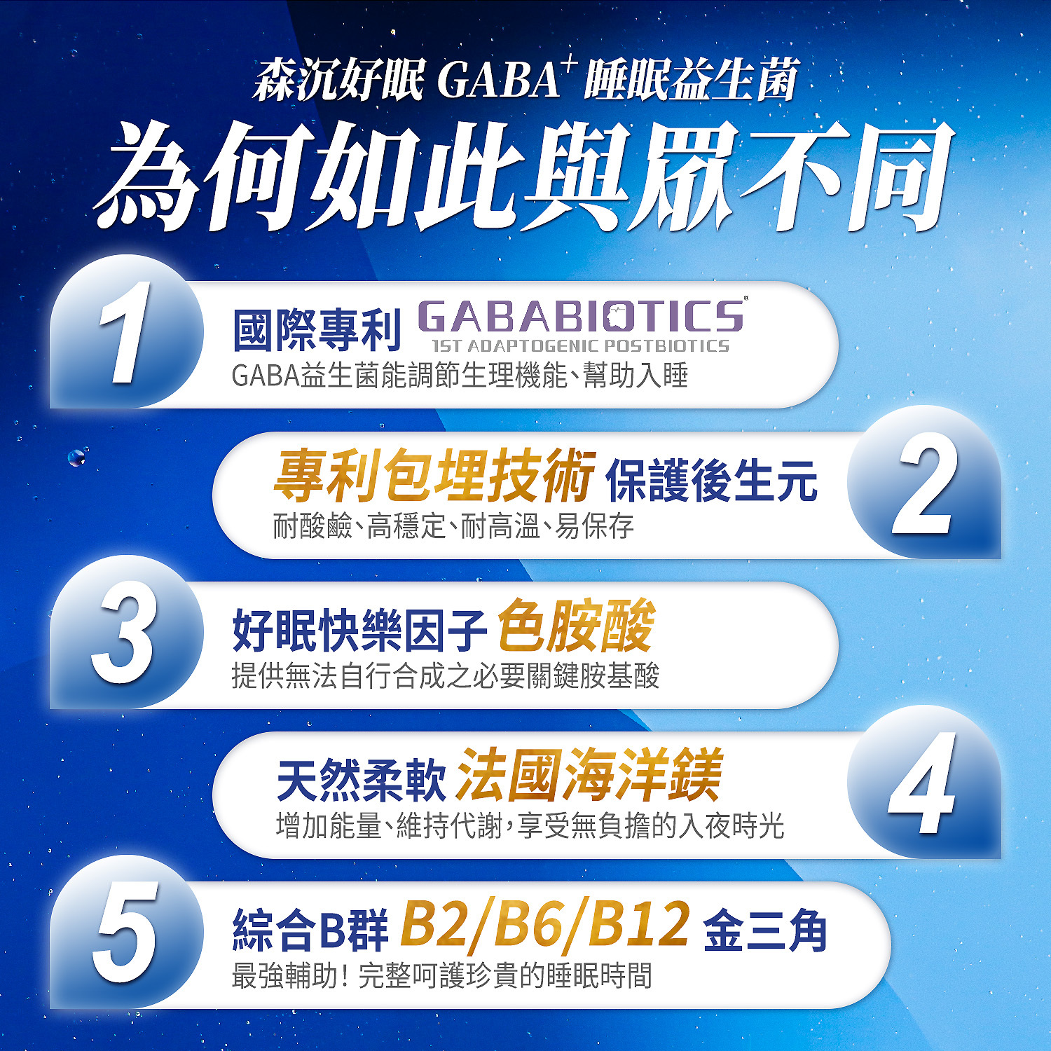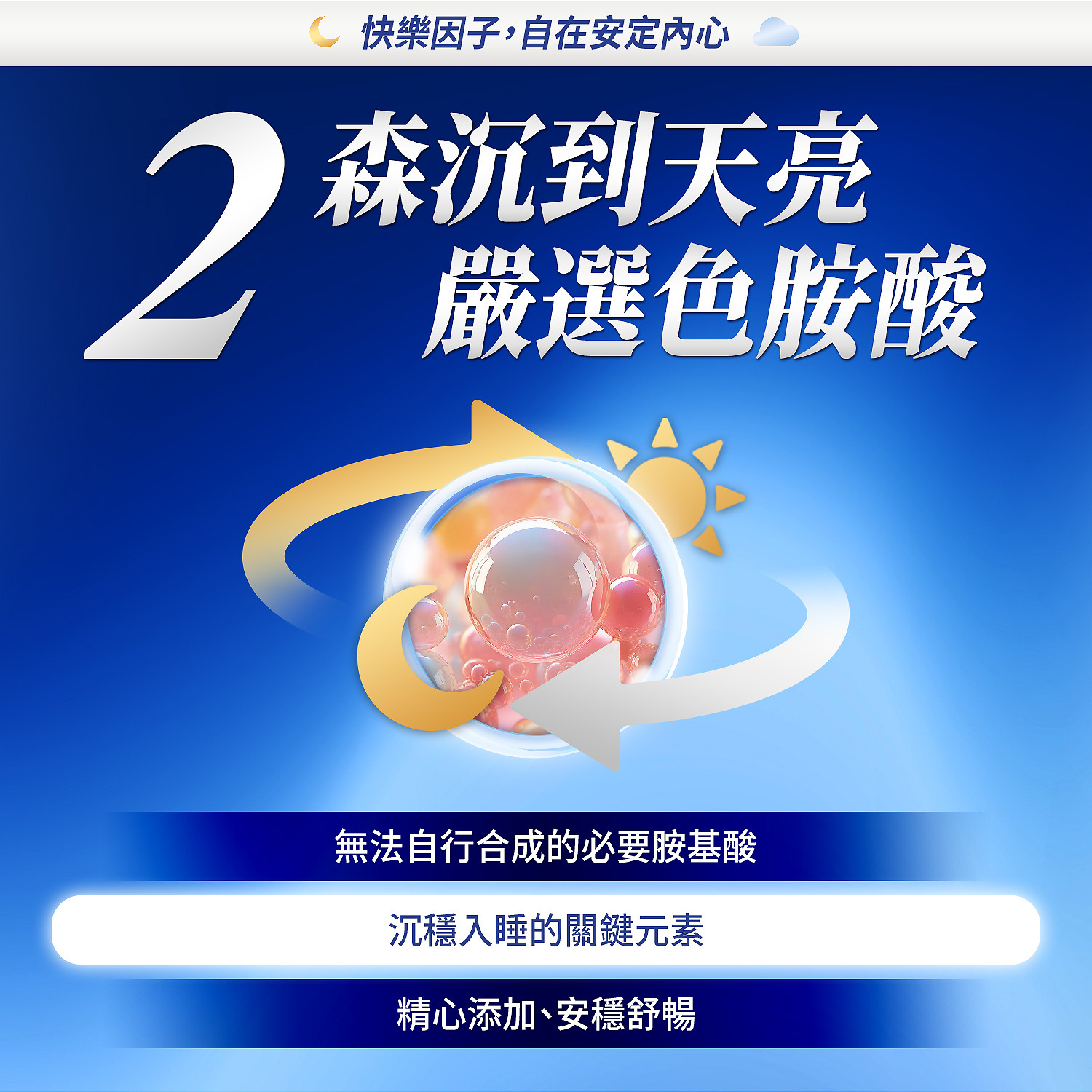 完整複方配方,幫助90%消費者順利入睡的完美配方,穩定睡眠品質,好好擁抱你的床。