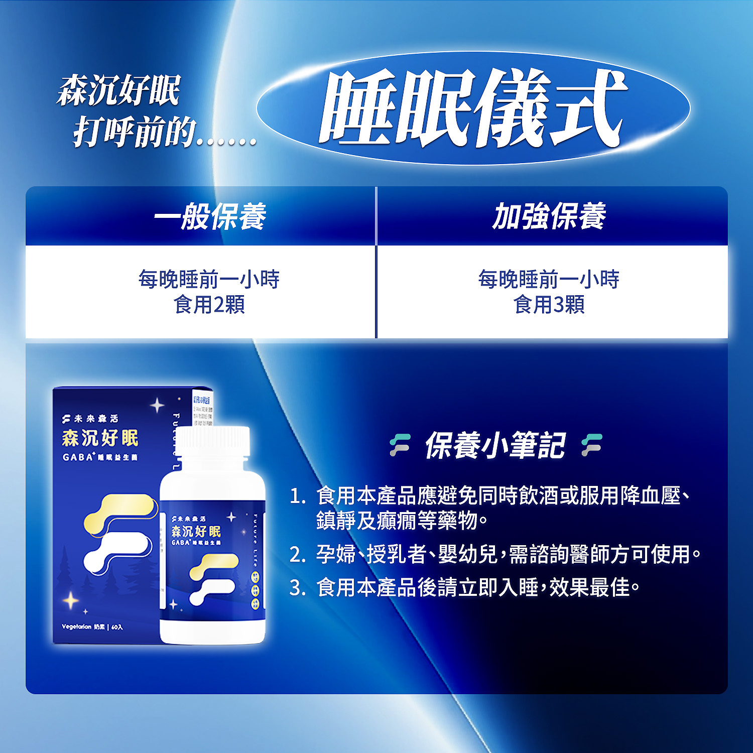 建議在睡前1小時食用,每次2粒即可;劑量可因個人體質狀況不同而有所彈性調整,建議在食用前可諮詢專業營養師找到最適合的食用劑量。