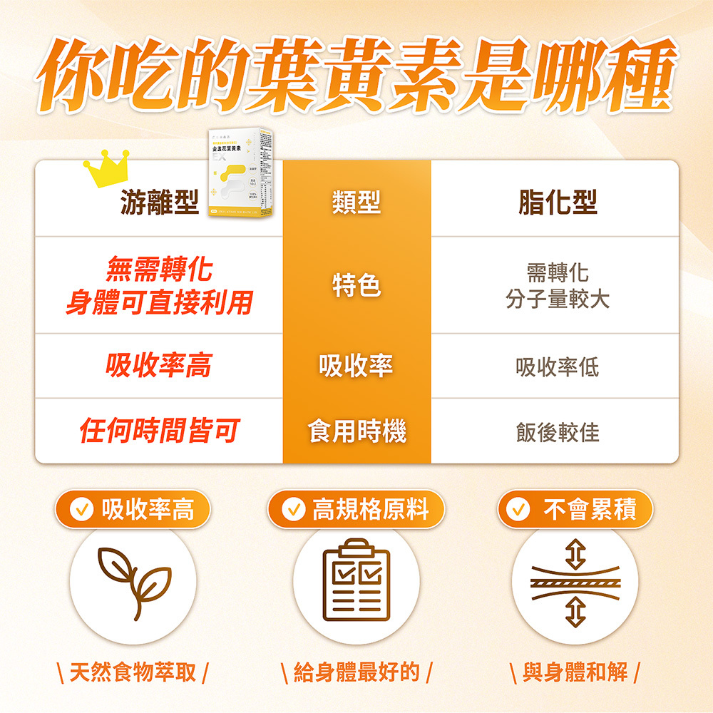 葉黃素的標示劑量與實際可被人體吸收的葉黃素還是有差異,需判斷該產品屬於哪一類型的葉黃素;「游離型葉黃素」的標示劑量不會因身體代謝而下降,標多少就是多少;而「脂化型葉黃素」實際被身體吸收利用的劑量可能比標示劑量還低。