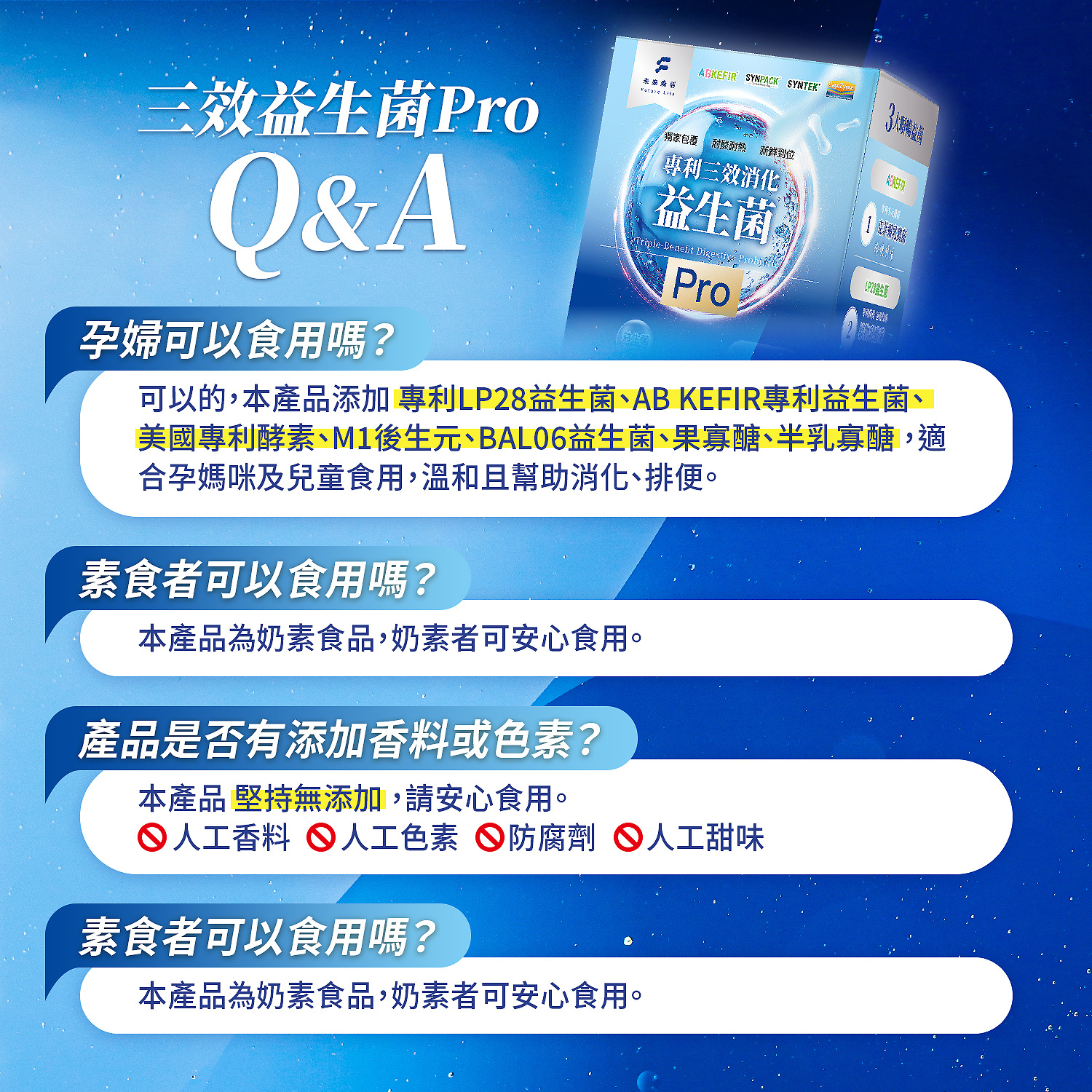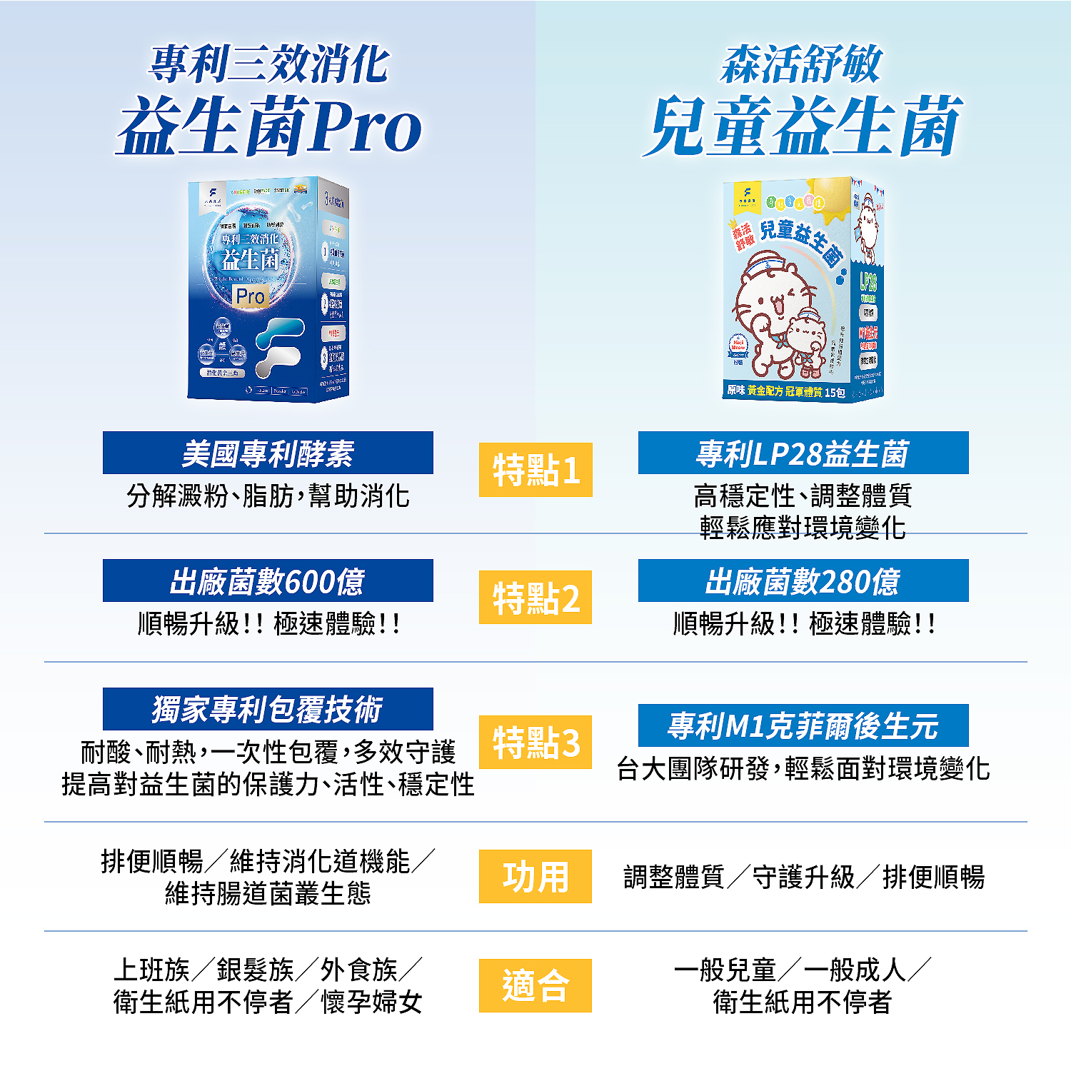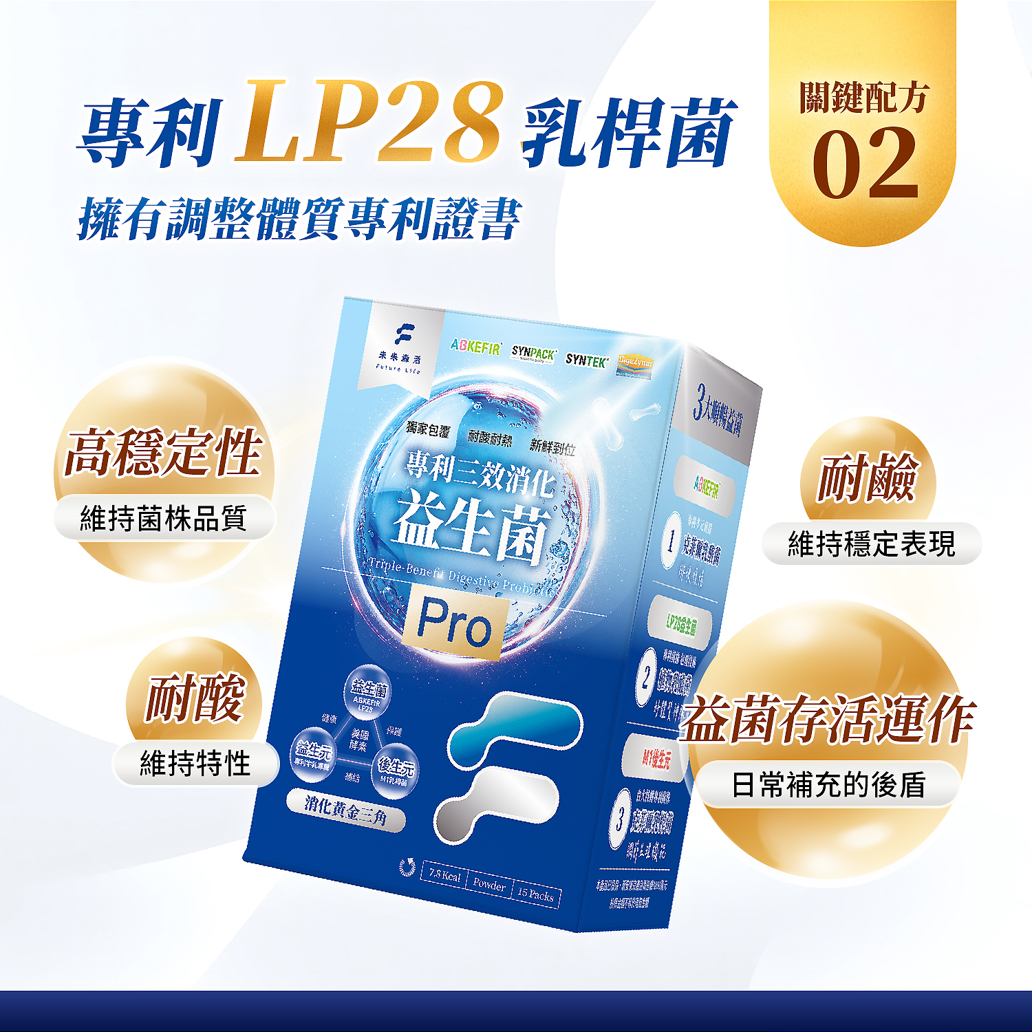 無論是學生、上班族,每天都面對著壓力,導致定時吃飯是一件奢侈的事情,在這樣緊繃作息的情況下,容易影響消化系統,而「專利三效消化益生菌」內有三大專利菌群(LP28、M1、AB KEFIR)、美國綜合酵素及果寡糖膳食纖維,可促進消化道蠕動,幫助維持消化道機能,使排便順暢。