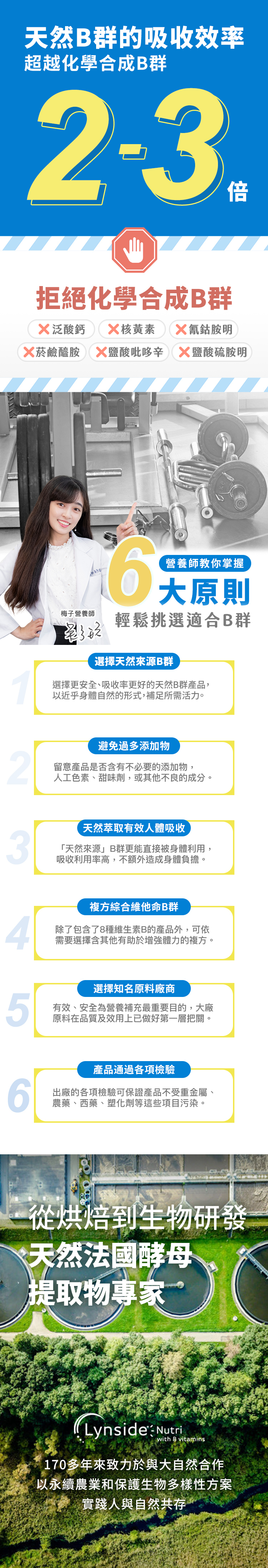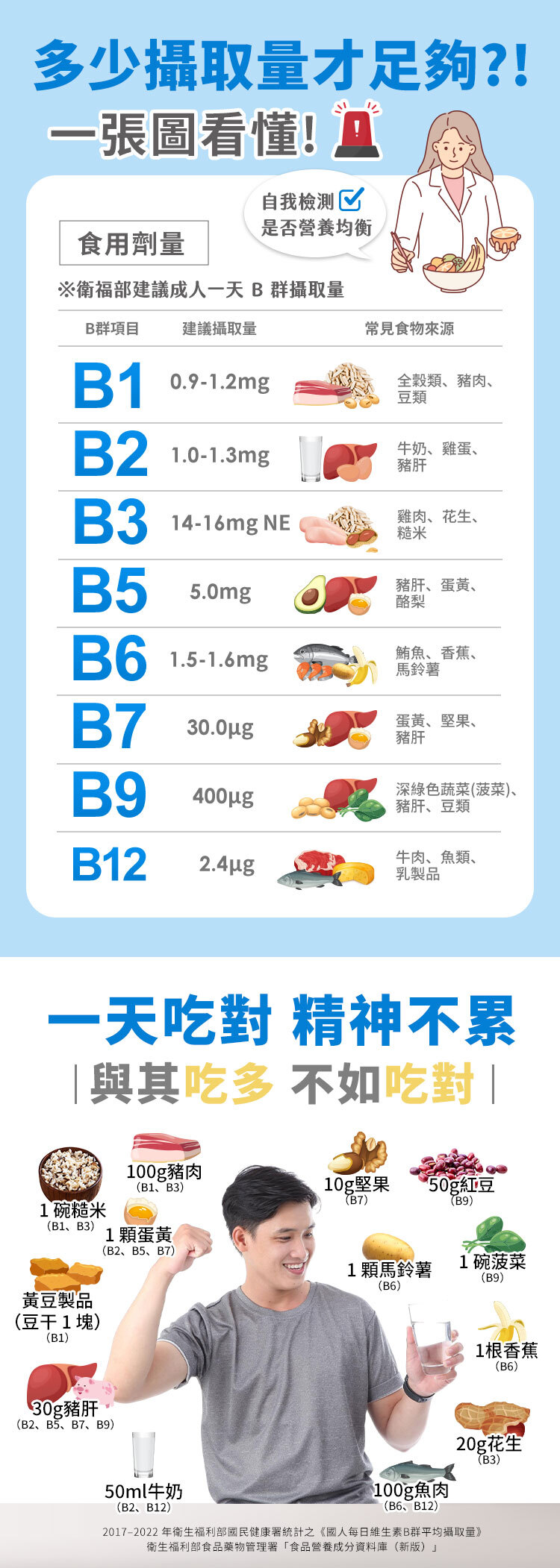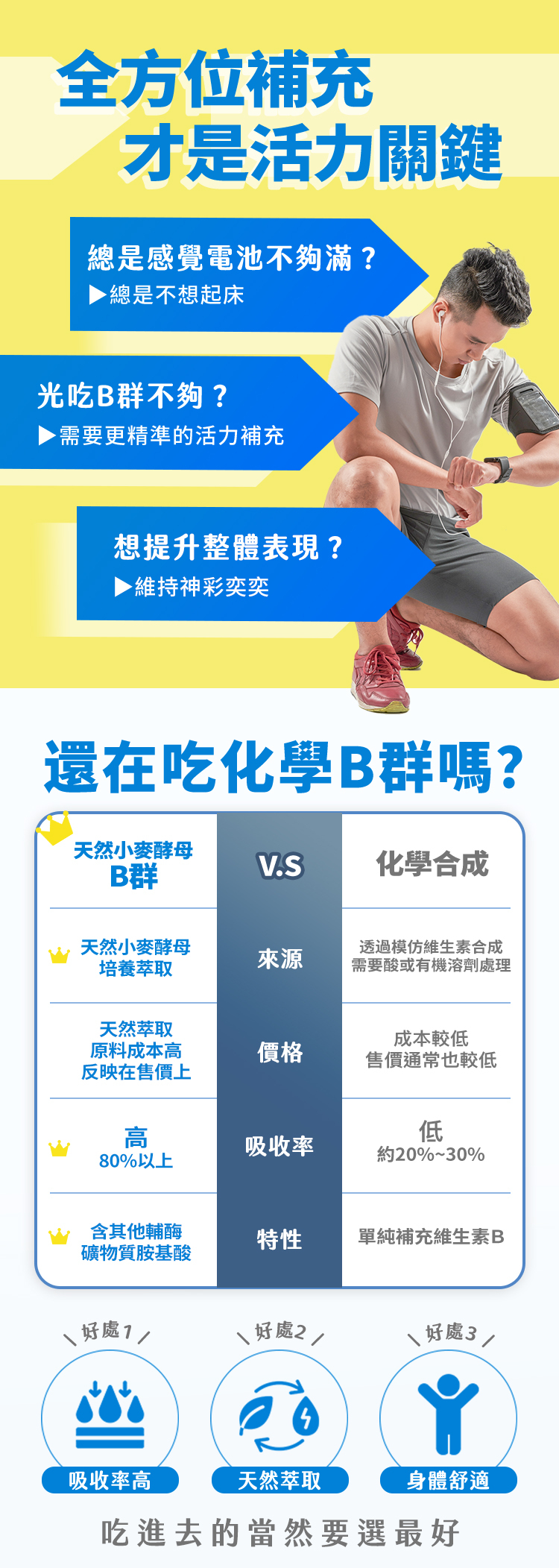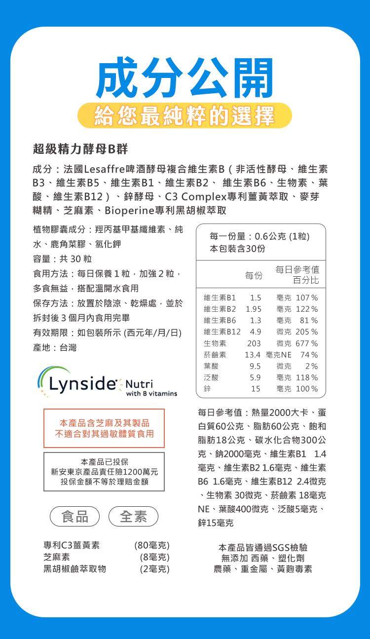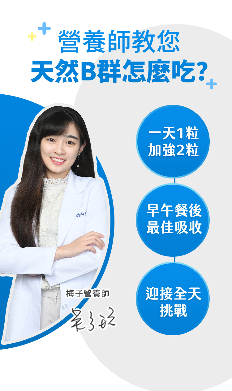 現代人每日飲食不均衡、工作壓力大、經常應酬喝酒,長期疲勞累積的狀況下,容易導致體內B群大量流失,除了平時適當紓壓及均衡飲食外,補充含有「足量天然萃取B群、薑黃萃取、酵母鋅」等有效成分,滋補強身、增強體力!