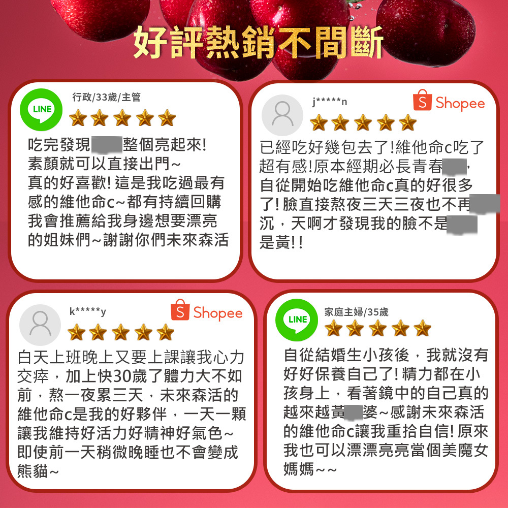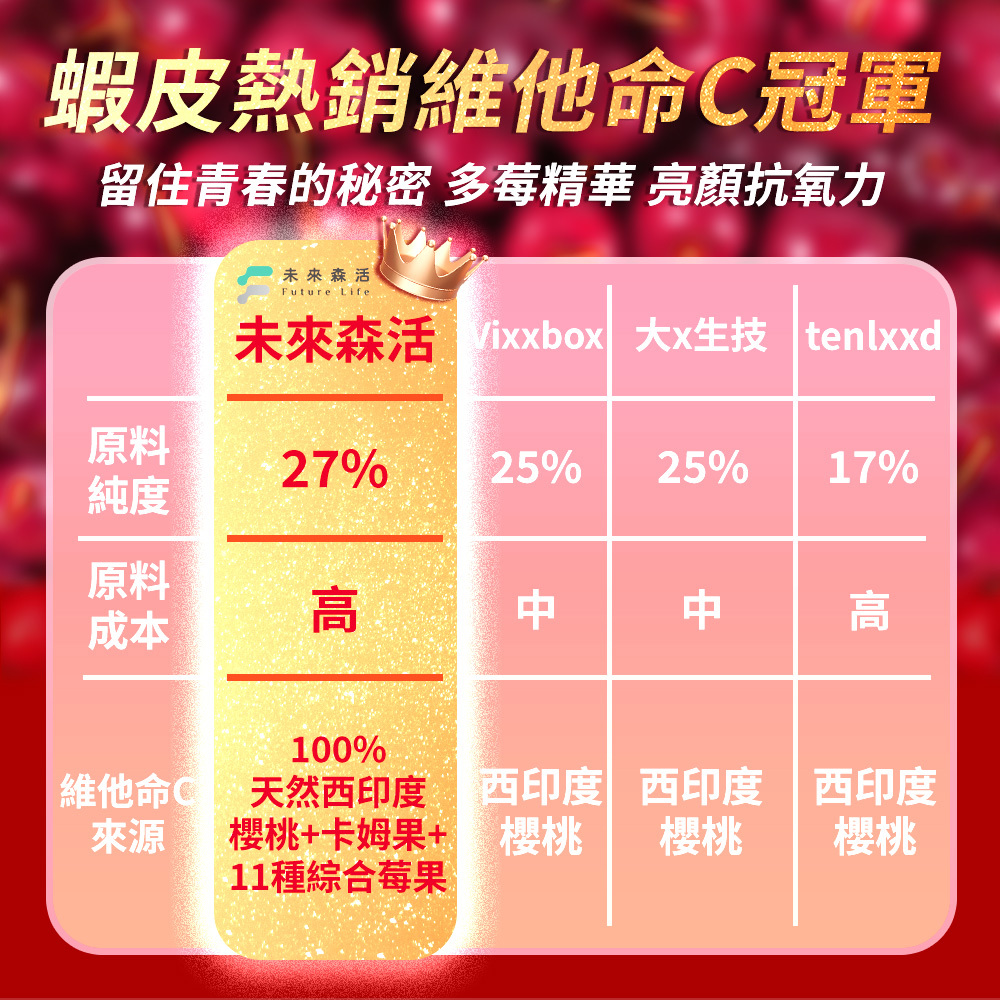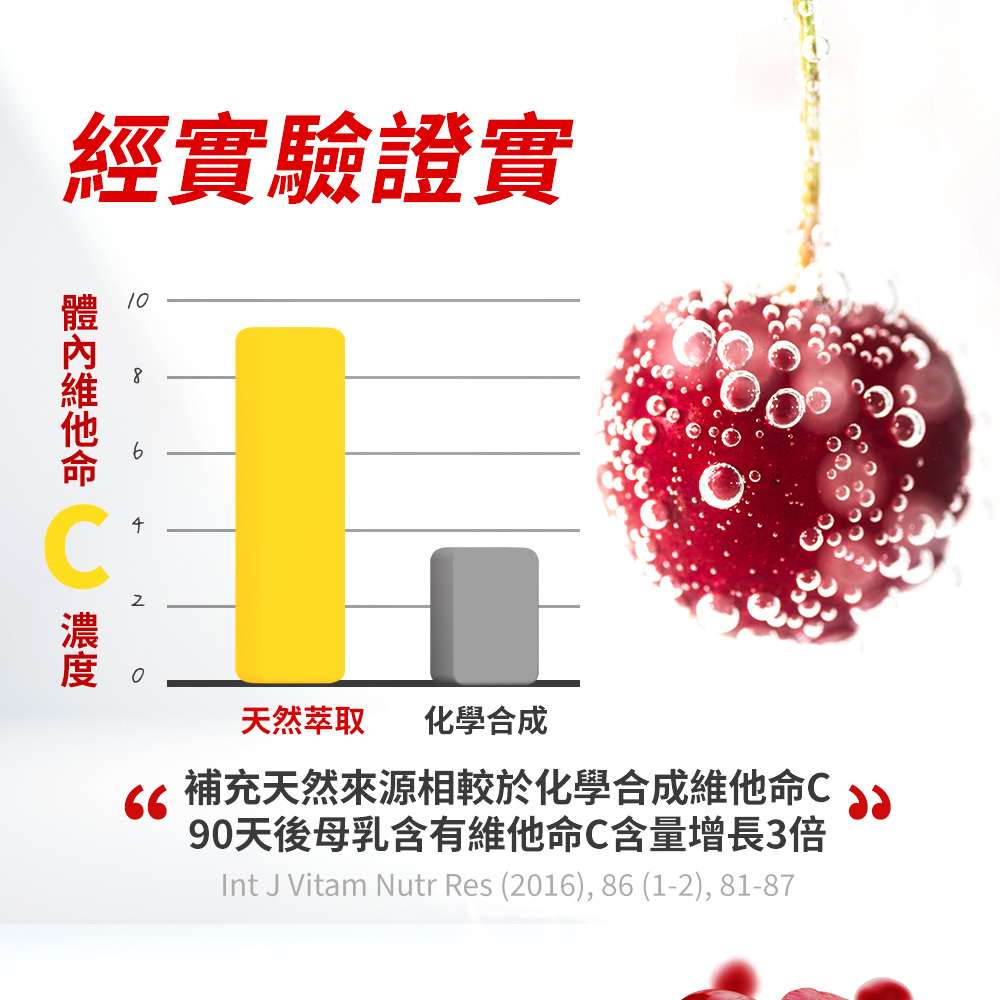 包含多種天然來源的維生素C萃取物,如:西印度櫻桃、卡姆果萃取及多種莓果類,成分純淨,健康無負擔。