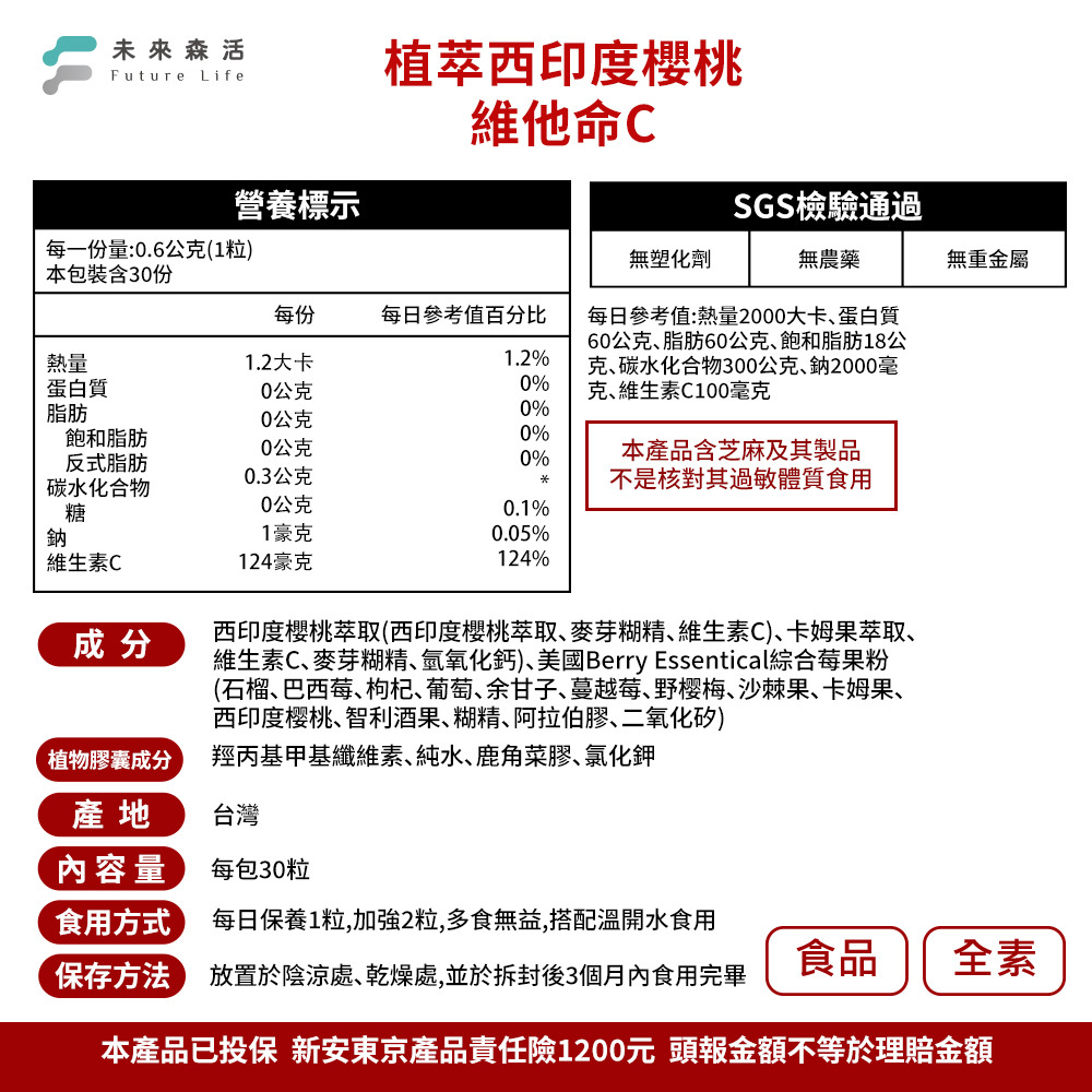 天然莓果萃取,生物利用率高,根據國建署DRIs維生素C每日建議量100mg的標準,"未來森活-綜合莓果+卡姆果王 植萃西印度櫻桃維他命C" 1粒即含有124毫克,足量好吸收。